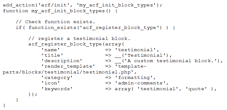 Register a block type similar to registering a post-type in thefunctions.php file using the function acf_register_block_type() which accepts an array of parameters. Look at the code snippet of a custom testimonial block(example)below:
