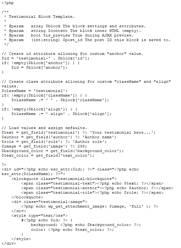 Define how ACF will render the custom block by creating a WordPress PHP templateas shown in the code snippet below that uses the ACF API functions to define the render by calling the respective fields from the field group created in the previous step. This can be accomplished by creating a template file within the current theme that matches the render_template setting used when registering the block. In this example, the template file will be called ‘template-parts/blocks/testimonial/testimonial.php’.