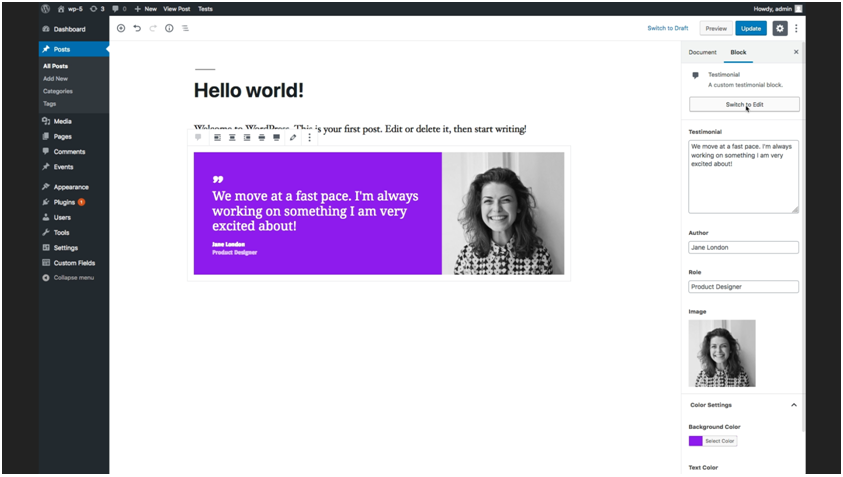 After these 3 steps are successfully carried out, developers can directly start using the just createdcustom “testimonial” block from the Gutenberg editor and position it anywhere within their content as required.